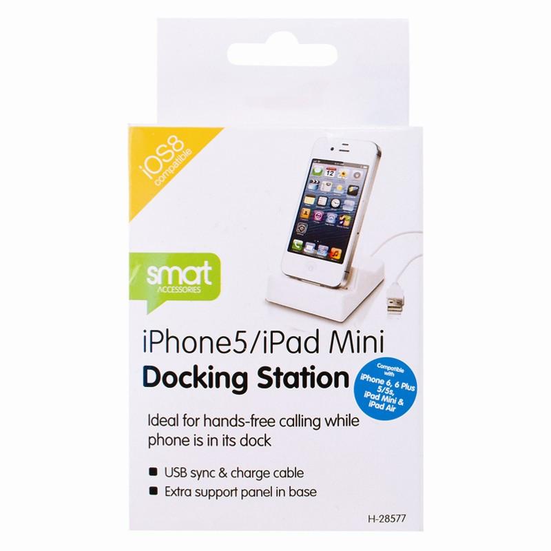 This iPhone 5/iPad Mini Docking Station is compatible with iOS8 and has a USB cable to sync, charge and update the device.
